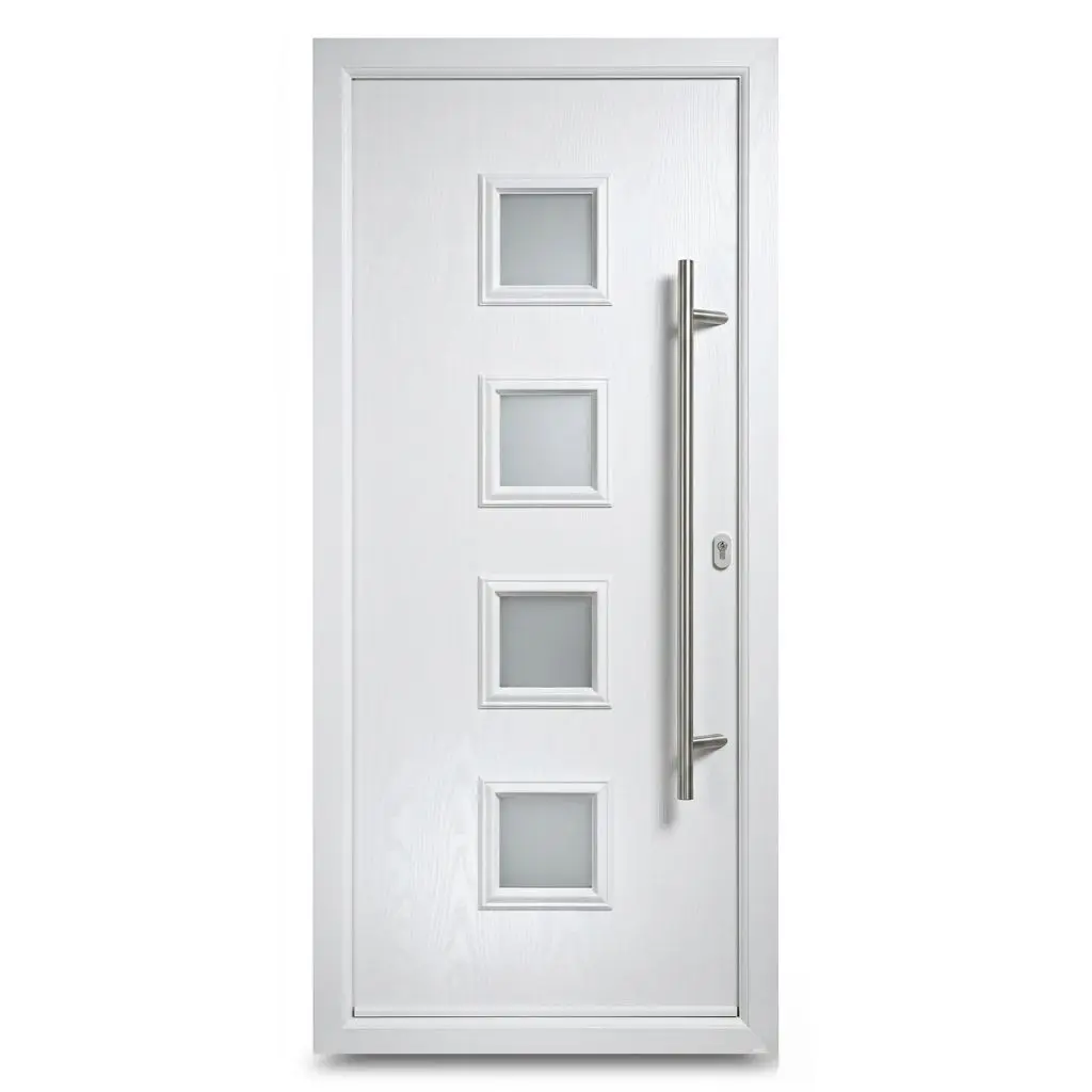 This white composite door keeps things clean and confident. The smooth white finish works beautifully on both modern and traditional homes, and those four square glazed panels give it just enough detail without making it busy. The glass panels run vertically down the centre, allowing natural light into your hallway while still maintaining privacy thanks to the subtle frosted finish.