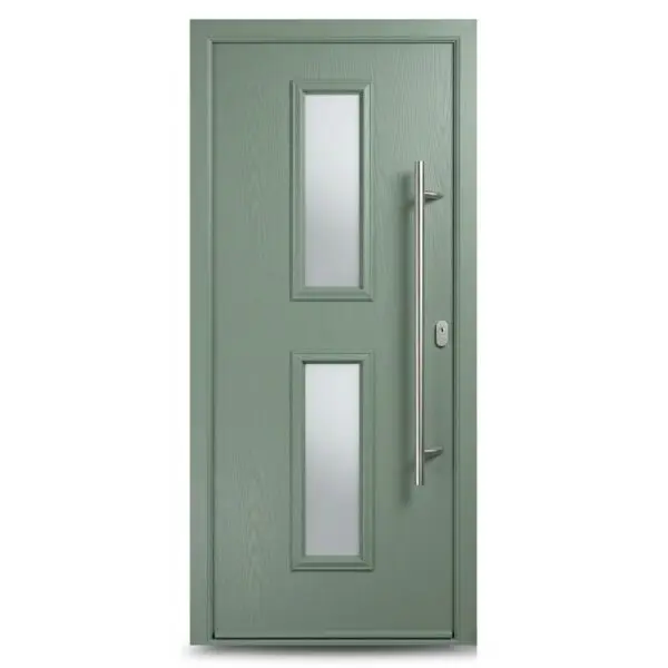 With two vertically aligned glazed panels, the design allows natural light to enter your hallway while keeping privacy intact through its frosted finish. The proportions feel considered and symmetrical, giving the entrance a refined look rather than something overly decorative. Paired with the long stainless steel bar handle, the door feels modern and confident.