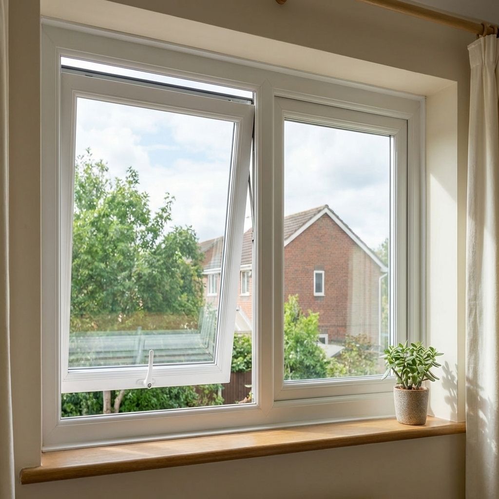 These double uPVC casement windows combine one top-hung opening section with one fixed glazed panel, all built into a single frame. It’s a practical setup that gives you controlled ventilation while keeping a large, uninterrupted glass area for light and views.