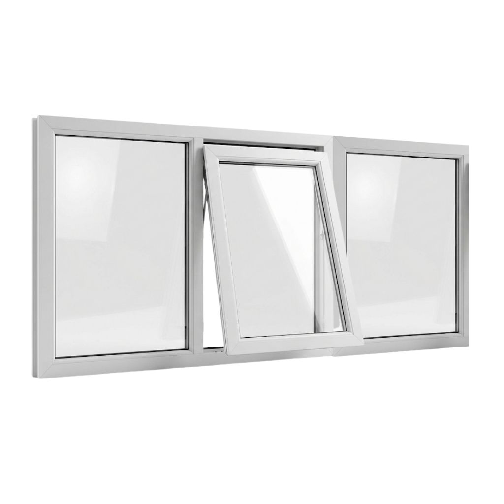 This uPVC casement window in a fixed, top-hung, fixed configuration is designed to combine wide glazed areas with simple, controlled ventilation. The window is manufactured as one single unit with three vertical sections, where the centre panel is a full-height top-hung opening casement, and the panels on either side remain fully fixed.