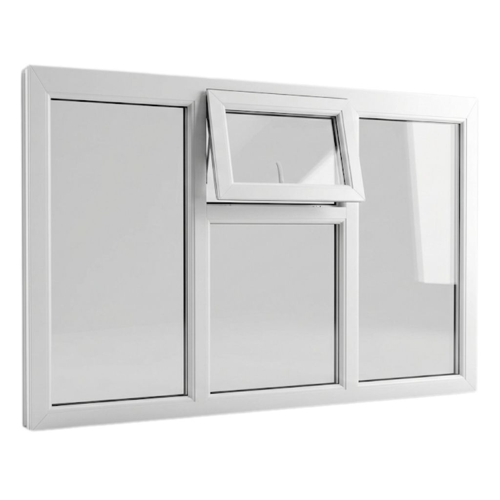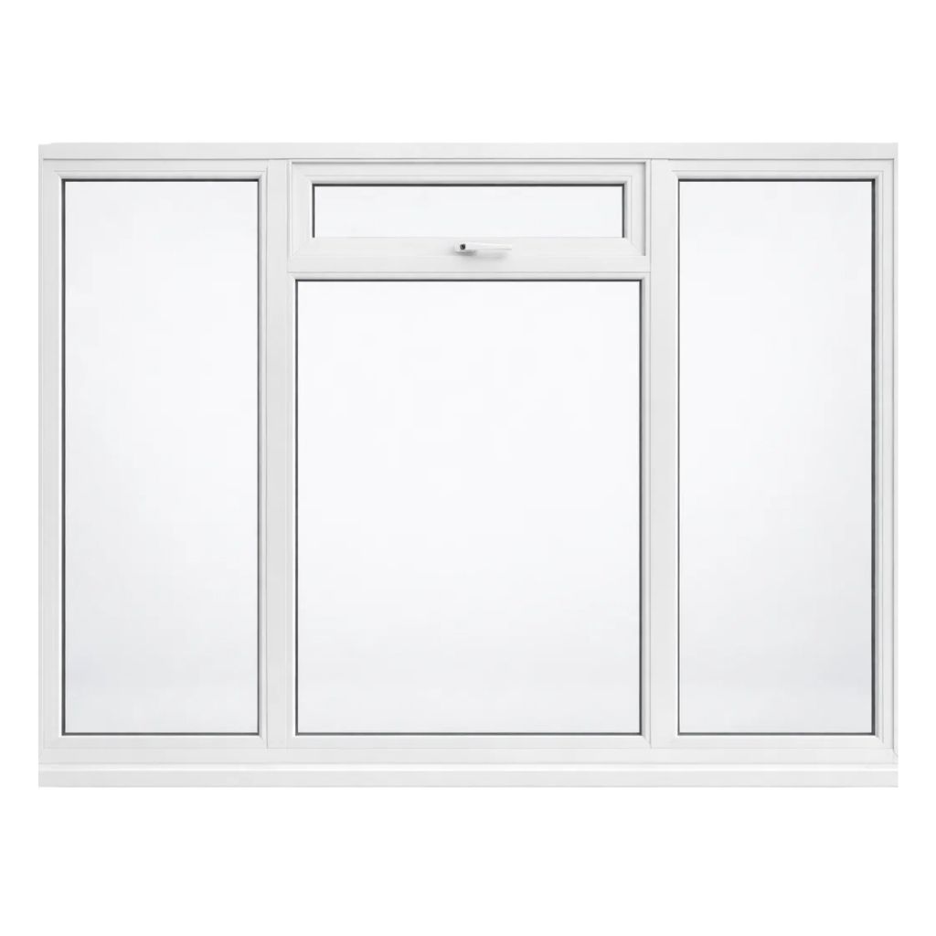 The centre section features a top-hung vent positioned at the upper part of the window, with the lower portion remaining fully fixed. This vent provides controlled airflow without opening the main window area, which is ideal for rooms where regular ventilation is needed but space, safety, or privacy must be considered. This type of layout is commonly used in uPVC casement windows where a balance between airflow and energy efficiency is important.